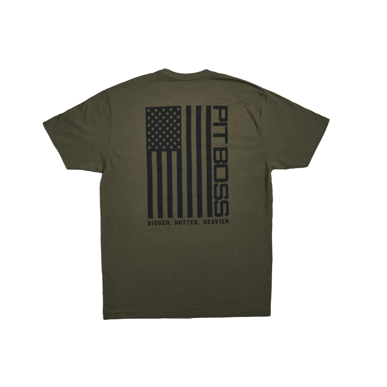 Bring the heat and make a statement as bold as your grill flavors. A perfect blend of comfort and style, the Pit Boss® Vertical Flag T-Shirt features our woodmark logo on the front and back and a specially designed Pit Boss® American Flag on the back, and boasts a casual, lightweight fit made from premium materials.